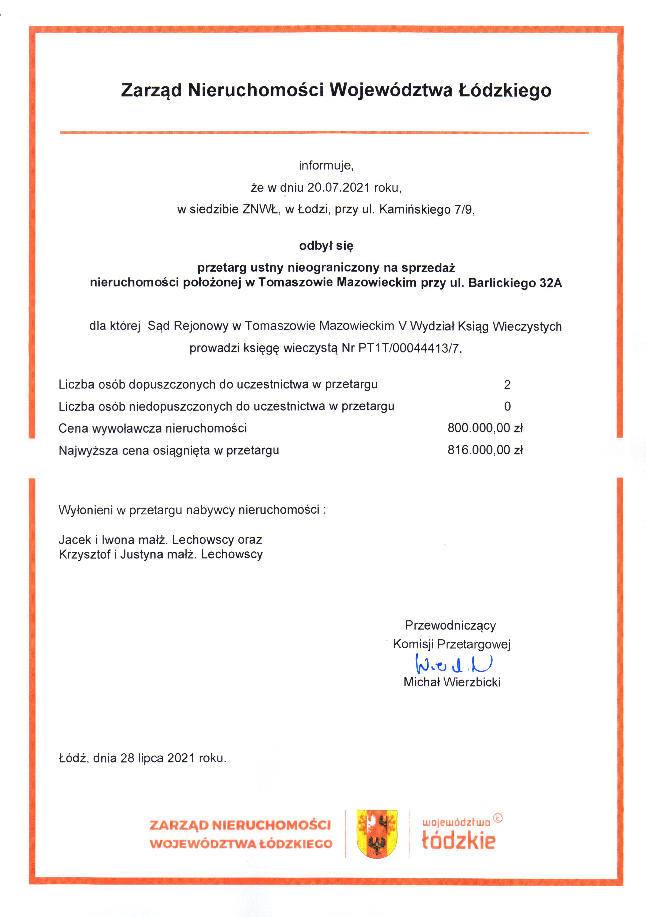 ZARZĄD NIERUCHOMOŚCI WOJEWÓDZTWA ŁÓDZKIEGO informuje o wyniku przetargu z dnia 20.07.2021 r. na sprzedaż nieruchomości położonej w Tomaszowie Mazowieckim przy ul. Barlickiego 32A