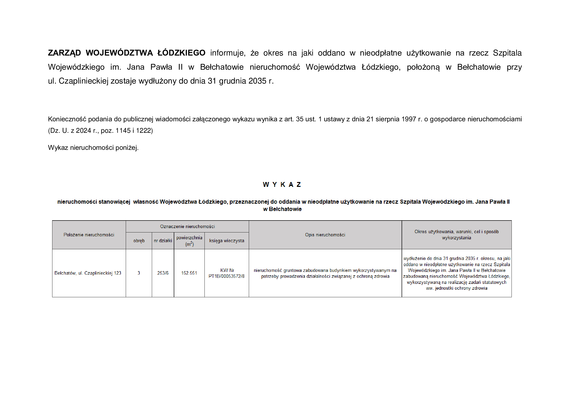 ZARZĄD WOJEWÓDZTWA ŁÓDZKIEGO informuje o wywieszeniu wykazu nieruchomości Województwa Łódzkiego przeznaczonej do oddania w nieodpłatne użytkowanie na rzecz Szpitala Wojewódzkiego im Jana Pawła II w Bełchatowie, położonej w Bełchatowie przy ul. Czaplinieckiej 123.