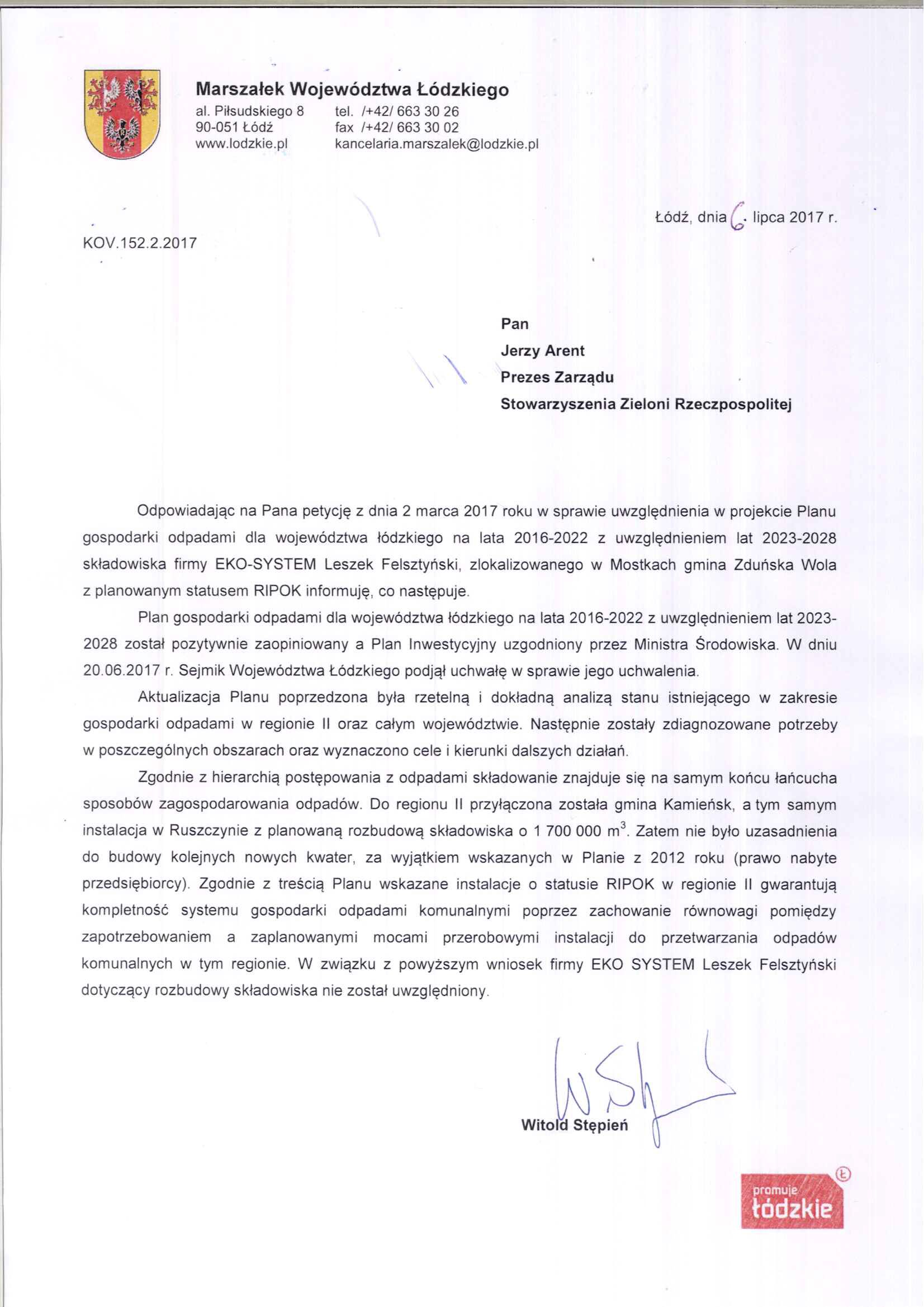 Petycja w sprawie zmiany projektu Planu Gospodarki Odpadami dla województwa łódzkiego na lata 2016 - 2022 dotyczącą ujęcia w projekcie Planu składowiska odpadów w Mostkach jako planowaną regionalną instalację przetwarzania odpadów komunalnych